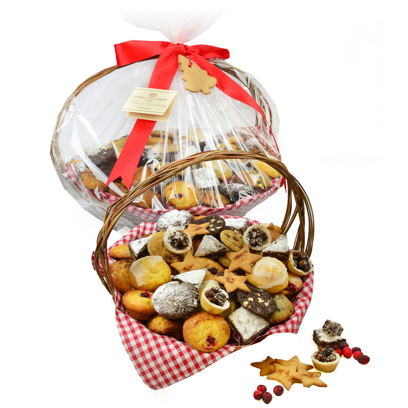 This is the perfect gift for the holiday season and contains a selection of added mini mince pies, vanilla star-shaped cookies, cranberry muffins and cranberry & white chocolate brownies in addition to our classic collection. Each basket is wrapped with festive red gingham cloth & ribbon, and a hanging handmade cookie tree, star or bell decoration.