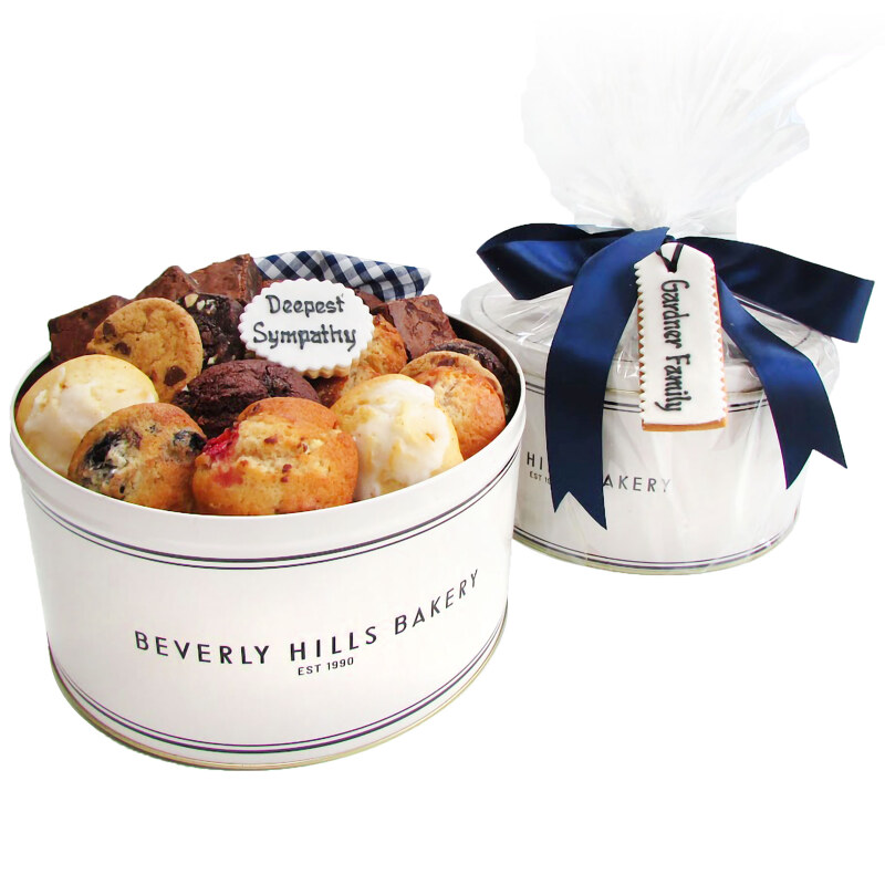 Our newest Sympathy Gift Tin is filled with mixed flavours of mini muffins, cookies and brownies with an added handwritten "With deepest sympathy" cookie and a hanging handmade cookie with the recipient's name. In navy blue gingham cloth and ribbon, this is a kind and thoughtful gift to send to family, friends and acquaintances that have lost a loved one. We will automatically place the first name of the recipient’s as written on the address on the cookie. Should you wish a different name please call or email the Bakery.