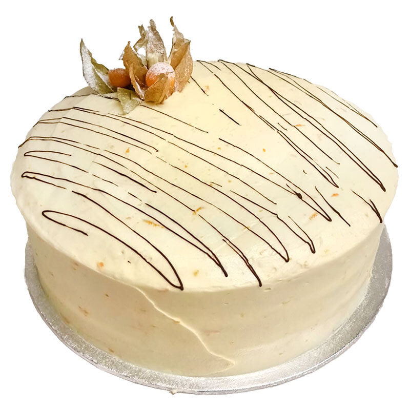 Our famous American carrot cake, is made to a traditional recipe rich in flavour and warmth! Filled with layers of cream cheese frosting with cinnamon, raisin, walnuts, and of course, carrots, it's delicious for a morning or afternoon coffee/tea break. A cream cheese frosting with fresh orange rind, drizzles of chocolate and fresh physilis, finishes this tropical treat.