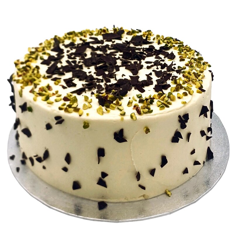 Our Chocolate & Pistachio Cake was created by popular demand! Soft chocolate sponge is layered with a pistachio cream filling mixed with crushed fresh pistachios, surrounded with our delicious cream cheese frosting, decorated with more crushed fresh pistachios and handmade dark chocolate flakes - a beautiful cake indeed!