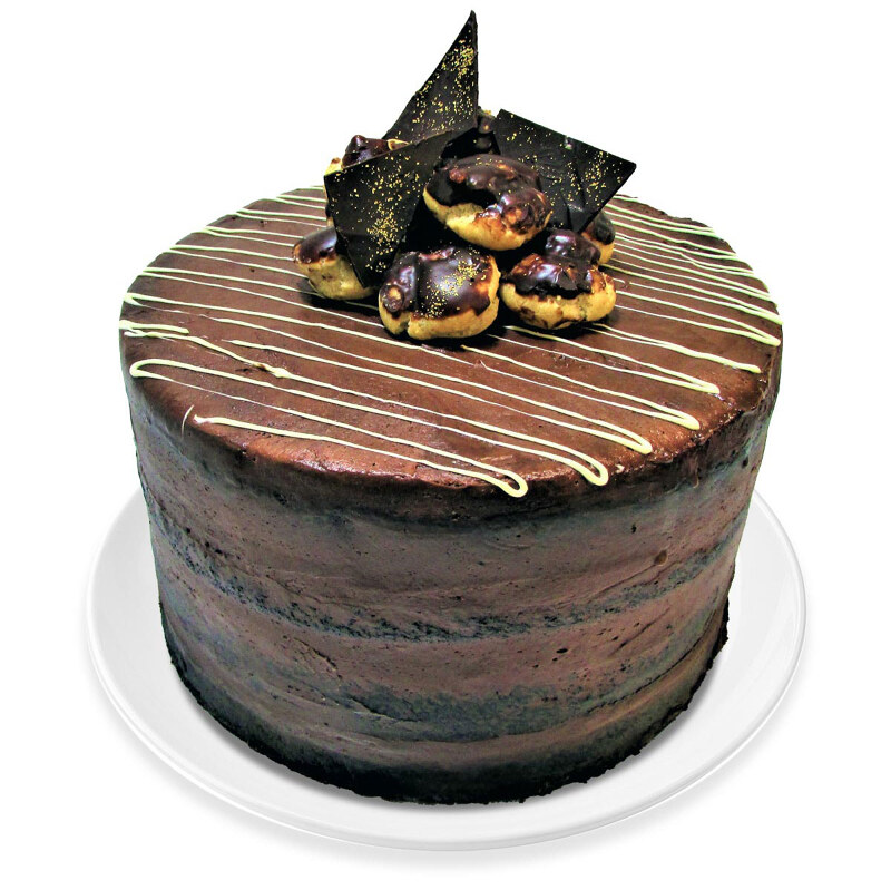 Our Chocolate Profiteroles Cake is layered chocolate sponge and buttercream frosting, topped with handmade chocolate profiteroles filled with fresh coffee custard cream, decorated with gold leaf chocolate shards. A sophisticated dessert....