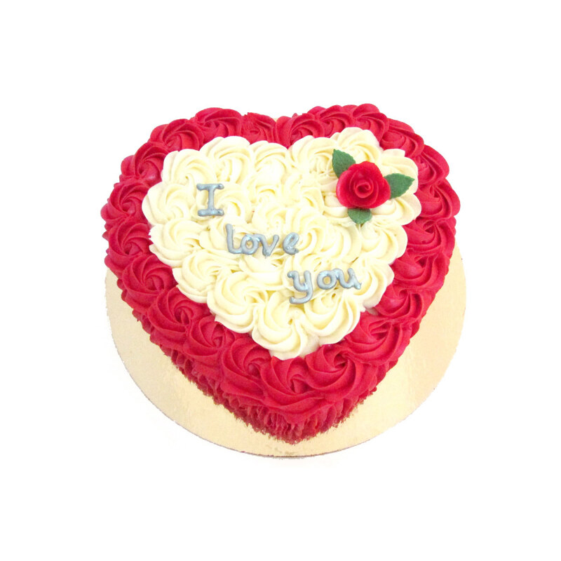 This one is for the Romantics out there! Our moist and fluffy red chocolate flavoured sponge cake in a heart shape, is layered with buttercream and covered with a delicate red and white cream cheese rosettes design, decorated with a hand made red sugar rose.
