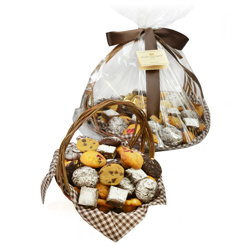 Freshly-baked, handmade Double Chocolate and Strawberry & White Chocolate mini muffins, alongside mini Chocolate Chip and Double Chocolate Chip cookies, and to finish it off - our famous Double Fudge Chocolate & Walnut brownies!