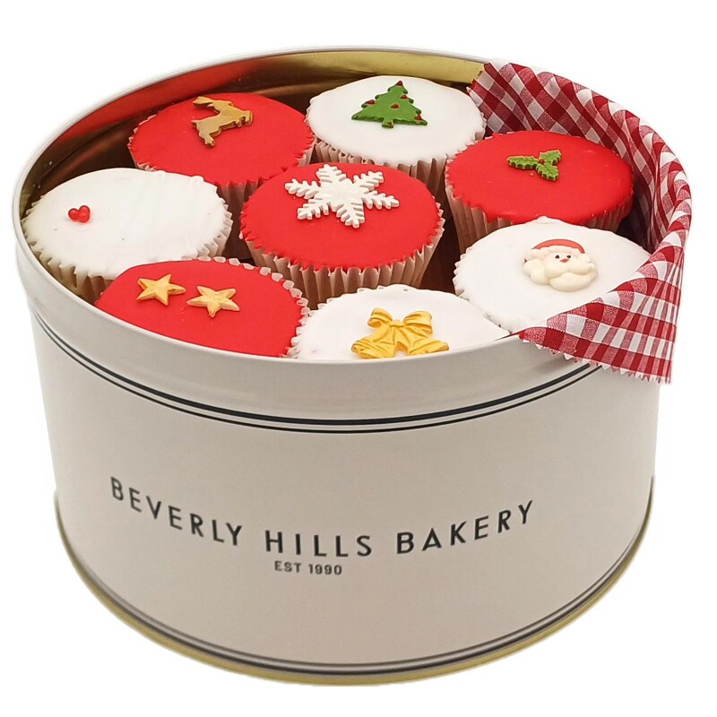Our cupcakes are elegantly packaged in our Beverly Hills Bakery Gift Tin, wrapped with red gingham cloth and ribbon with a hanging Christmas decoration.